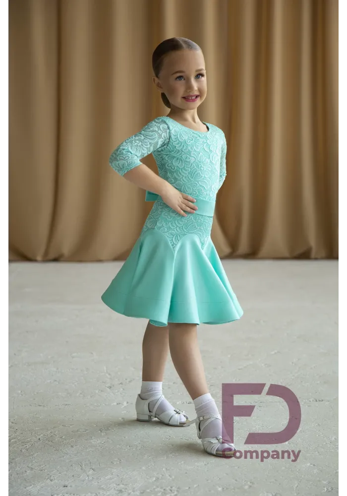 Juvenile Competition Dress, based on a leotard, made of supplex jersey, the bodice is duplicated with guipure. The product has a guipure three-quarter sleeve, a round neckline, hidden zip at the back, and buttons at the bottom. A skirt with six wedges in the form of "arches", trimmed with a hem with a regiline 5 cm wide (28-30 size), 8 cm (32-44 size). Includes detachable belt with bow. model size 30