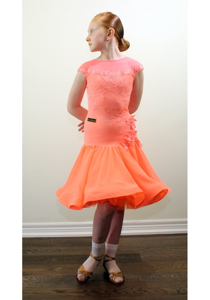 Girl's Competition Dress Ballroom/ Latin competition dress made of stretch lycra with lace and flower decoration on the side. Skirt made of satin chiffon and organza underskirt layers. Zipped on the back ...